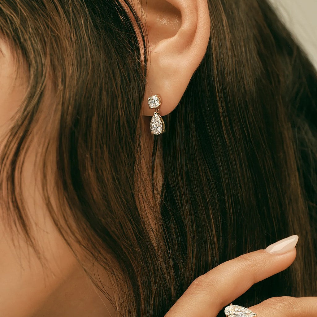 Refined sparkle with graceful movement. These elegant earrings feature a round moissanite stud paired with a pear-cut drop, delicately set in polished gold. Designed to catch the light with every turn, they bring timeless brilliance and feminine elegance to both everyday wear and special occasions.