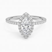 The Imani Ring features a masterfully cut marquise moissanite, embraced by a scintillating pavé halo that enhances its elongated silhouette. Set on a slender gold band adorned with delicate moissanites, it radiates an understated opulence—elegant, enduring, and designed for those with a taste for quiet luxury.