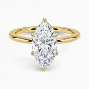 Graceful and captivating, the Karie Ring showcases a marquise-cut lab diamond that elongates the finger with its elegant silhouette. A subtle hidden halo rests beneath the center stone, enhancing its brilliance without taking away from the simplicity of the gold band. A refined statement of sophistication and modern romance.
