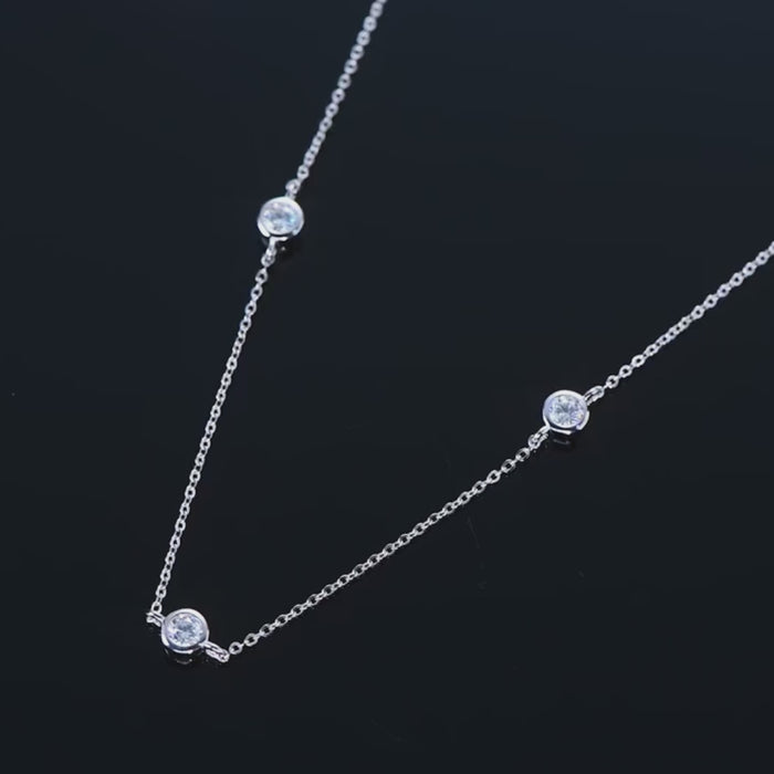 Understated elegance meets timeless brilliance in this exquisite station necklace. Featuring a delicate chain adorned with bezel-set moissanite stones, this piece offers a refined balance of sparkle and sophistication. The evenly spaced gems catch the light beautifully, creating a subtle yet captivating shimmer. Designed for versatility, this necklace is perfect for layering or wearing solo, making it a graceful addition to any jewelry collection.