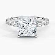 Exuding brilliance and modern elegance, this princess-cut moissanite ring features a breathtaking center stone secured by four prongs. The band is adorned with a shimmering row of pavé-set stones, adding extra sparkle and sophistication. Crafted in a sleek and durable metal, this ring is a perfect choice for those who seek timeless beauty with a contemporary flair.
